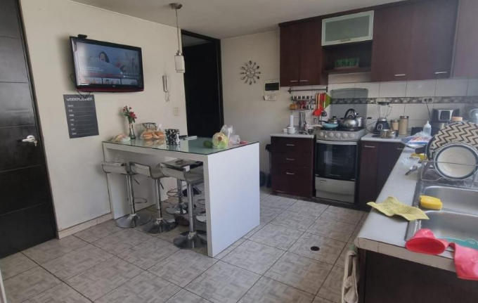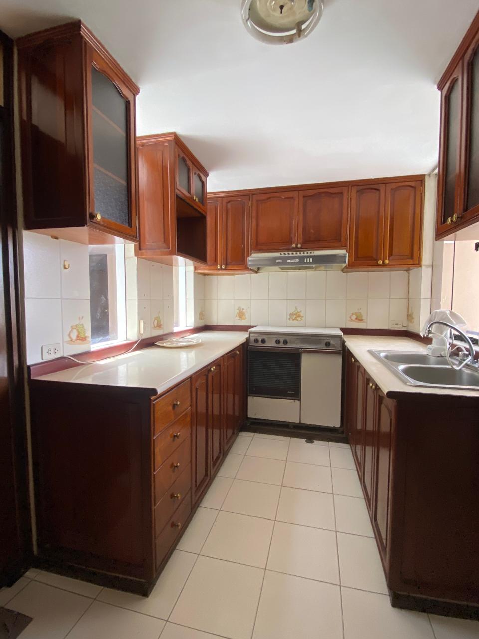 Cocina cerrada con reposteros altos y bajos, y amplia despensa